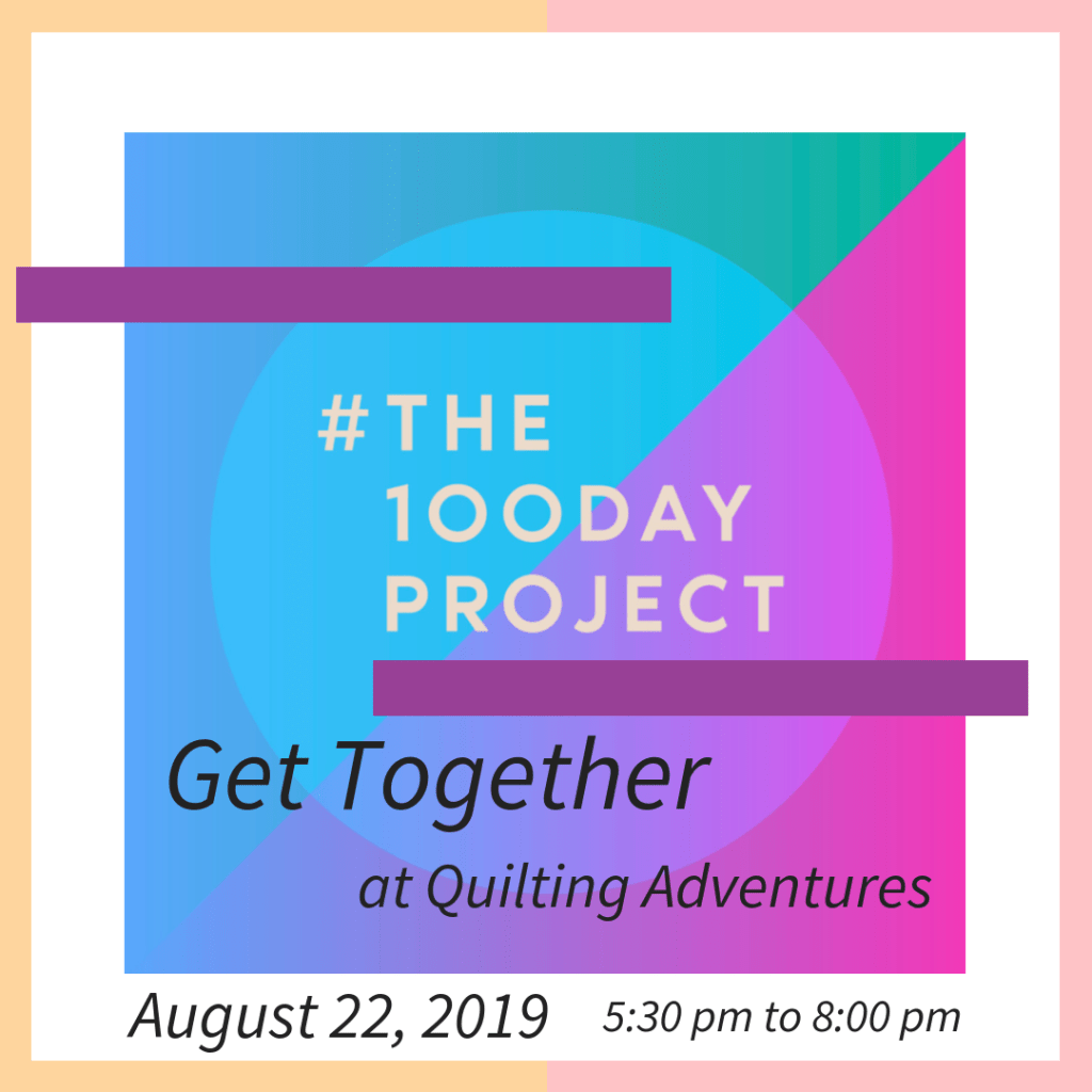 Quilting Adventures is hosting a Get Together to share our work and experiences from The 100 Day Project on August 22, 2019, from 5:30 pm to 8:00 pm. Address: 6943 Lakeside Avenue, Richmond, VA 23228. You are invited!